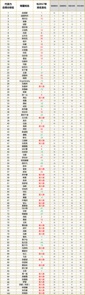 Some older Chinese celebrities still have influence power among general Chinese public. Many of which either still appears frequently on big screen or have recently climbed back into the ranking with more working schedule.