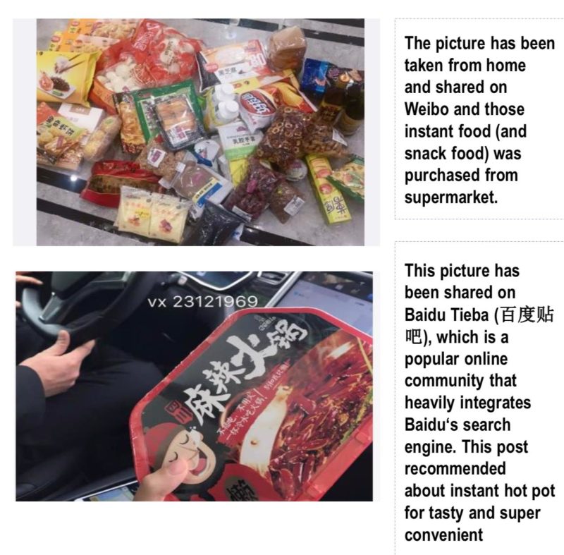 On social media, pictures about instant food are usually taken from the consumers’ home, cars, supermarket and convenience stores, most of the pictures are recommending different kinds of instant food because they are cheap, tasty and super convenient. Domestic brands and international brands are both very popular among Chinese consumers. Therefore, a large variety of instant food has gradually become a part of daily life for a part of the netizens.