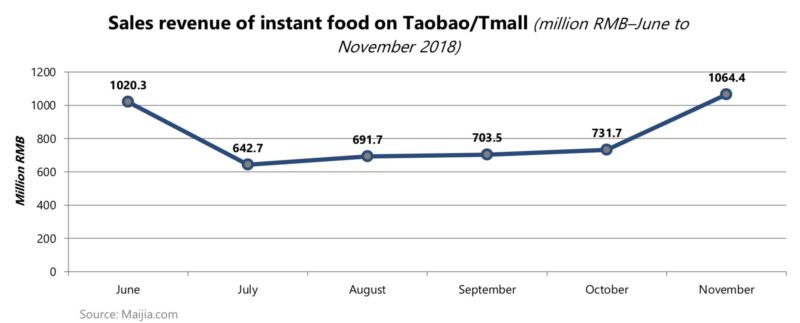Instant noodles showed the highest sales on Tmall/Taobao, which was the 9 times of instant rice (rice mixed with meat and vegetables) sales on the same platforms. The sales of instant meat were much higher than instant vegetables, which means instant/processed vegetables haven’t been popular in China.