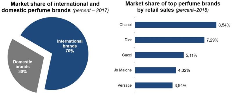 70% of the Chinese perfume market share comes from world known brands. Since Chinese consumers consider perfume as a luxury product, they tend to purchase perfume from high-end brands, which are exclusive from overseas. The top 5 brands by retail sales in the Chinese perfume market are Chanel (FRA.), Dior (FRA.), Gucci (IT), Jo Malone (ENG) and Versace (IT).