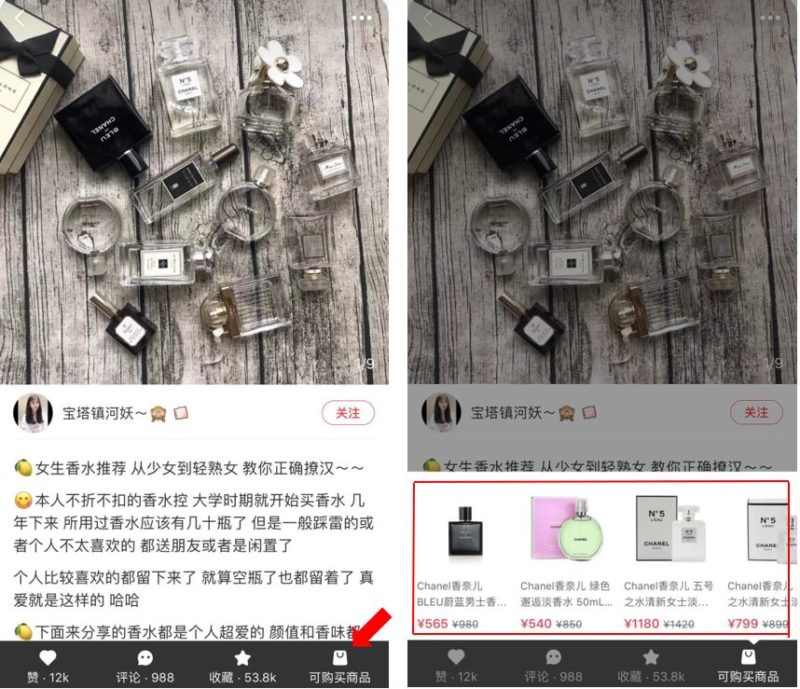 Last but not least, the emerging social media and e-commerce platform Xiaohongshu (小红书, also known as RED) is providing the opportunity for Chinese consumers to purchase perfume online. What makes Xiaohongshu special is its social and life-sharing character, the platform works closely with Chinese KOLs and celebrities. The following example is KOL’s article recommending nine different kinds of perfumes from international brands and shared her experience. At the bottom, readers can purchase directly the buyable products mentioned in the post, which in this case, all nine perfumes mentioned. This post got 12K likes and 988 comments. It also has been saved as a favorite for 53,8K times, which means many readers would view this post again in the future and take this KOL’s recommendation and user experience as a reference.