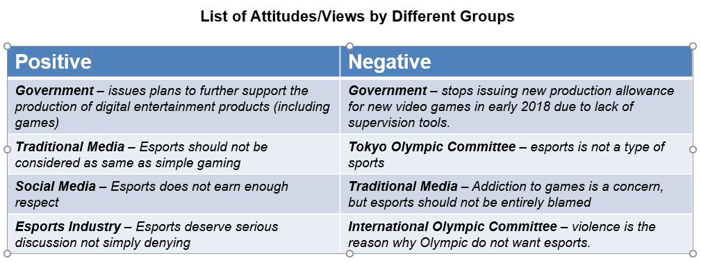 E-sports is still considered to be a controversial topic in China. Public attitudes towards gaming has largely affected the promotion of e-sports as a type of competition. Fortunately, the Chinese government and Chinese social media recognized the legitimacy of e-sports and a neutral view is now taking the advantage against the traditional negative views on e-sports in China.