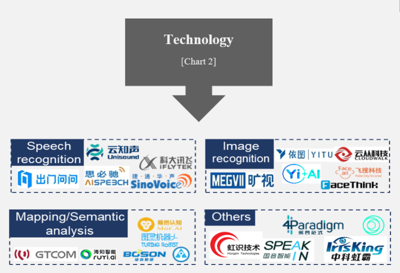 Delving into the AI market in China, we see that this technology already covers a wide range of segments. Some of the most dynamic areas include what Daxue Consulting defines as the basic layer—the basic parts and algorithms of AI products; the technology layer—technology which support AI products—and applications, which are the AI products in the different industries. In the graph below, we have clustered Chinese companies which make use of AI technology into four groups, depending on which specific segment the companies focus on: Applications, Technology, Basic, and Comprehensive, which refers to those companies that are working in all three areas.