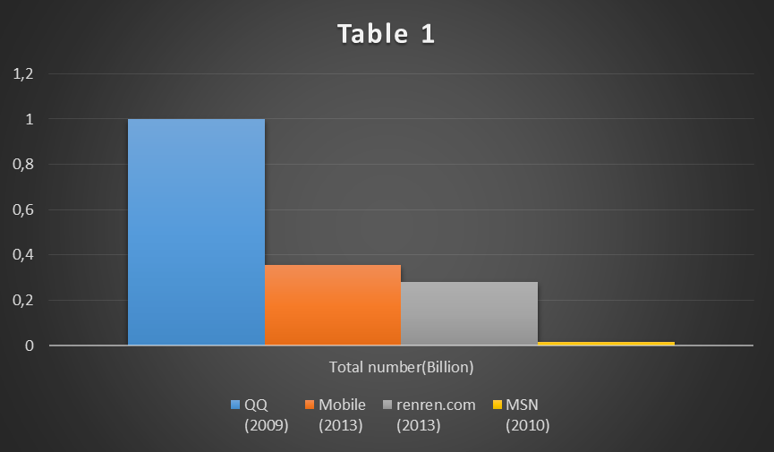 The main user resources (QQ & Mobile users) of WeChat occupy a distinct advantage than the other two. Firstly, QQ as IM software which is based on the traditional computer platform can appeal to the loyalty of the old users conveniently. On the other hand, specifically, the number of mobile users listed above refers to the smartphone users in China. As to the end of 2013, the mobile users in China had been expected to over 1 billion. Besides, Wechat supports over 100 countries’ mobile phone number while both WeChat and QQ have English version product in updating. It shall be the positive attitude for people to determine that the actual final number will be very likely to be a larger number.