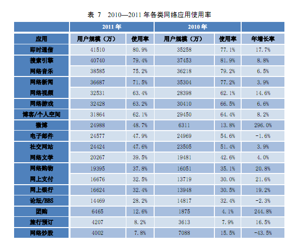 On 17th 2012, the China Internet Network Information Center (CNNIC) released the 29th China Internet development report, taking a sample of a total 6000 users, comprehensively covered fixed phones, PHS families, dormitory fixed phones and mobile phones. The report gave a comprehensive and detailed investigation and analysis on many aspects of internet usage in China in 2011. We abstract the information that mainly focuses on the usage rate of different kinds of network applications.