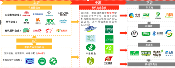 The upstream enterprises of the organic industry in China are mainly agricultural suppliers, farmers and organic assessment agencies. The midstream is comprised of organic agricultural enterprises. The downstream participants are transporters and distributors.