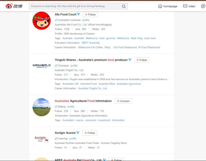 Like Canadian food, Australian Food companies in the health food aspect of the food and beverage market have accounts on digital platforms rather than specific restaurants associated with the terms “澳大利亚食品” and “澳洲食品”. Along with these accounts, Australian food producers and food information accounts exist.