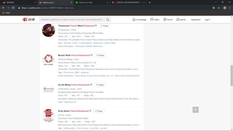 Using the term “法国餐厅” (French restaurants), multiple french restaurants appear in the search. However, these accounts have gone inactive. Other than these inactive accounts, no other French restaurants seem to use digital platforms such as Weibo for food promotions.