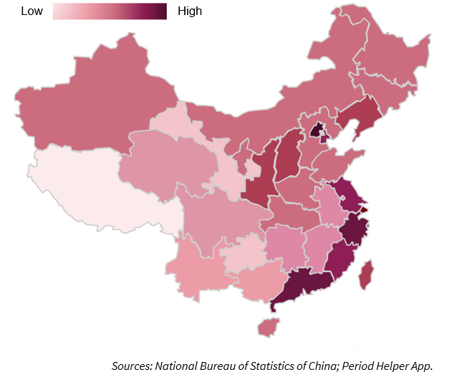 For example, as shown in the graph below the main cities and provinces which have a high female’s attention to feminine hygiene are the ones benefiting from the highest GDP and personal income in China. These regions are Beijing (City, GDP ranked 2nd in 2017), Shanghai (City, GDP ranked 1st in 2017), Zhejiang province (Province, GDP ranked 4th in 2017), Tianjin (City, GDP ranks the 6thin 2017) and Guangdong province (Province, GDP ranked 1st in 2017).