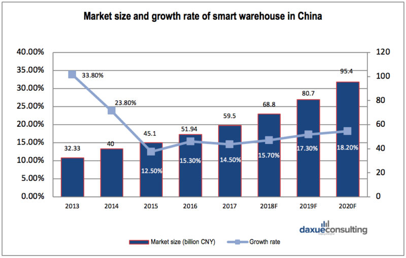 China has been the world largest robots consumption market as early as 2013, but domestic manufacturers only owned 30% market shares and most of them only confined to low-end products. Along with the rising of smart warehouse market, the demand for industrial and intelligent robots has been growing for years in China. More and more capable e-commerce and delivery companies will start to build smart warehouses to improve their efficiency of logistics, thus, domestic providers and manufacturers will achieve great benefits from smart warehouse market if they can develop products with more advanced technologies.