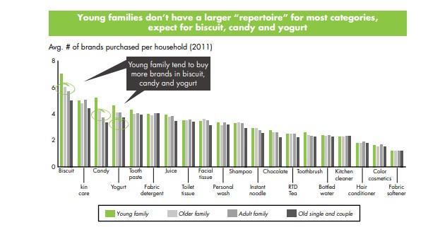There is a finding that is a bit surprising from a market research: consumers’ repertoire behaviors do not vary a lot across their different life stages, contrary to the common belief that younger consumers tend to be more curious than older ones, and they are always willing to try more brands than older and more ‘conservative’ consumers. However, it is clear from the market study that, in most repertoires that were studied, the repertoires of younger families is not much larger. There are exceptions, though. They buy biscuits, candy and yogurt among more brands.