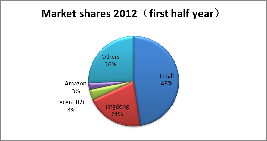 Tmall, spun off from Taobao into a separate business in 2012, is the largest B2C e-commerce platform in China. The site stocks over 70,000 Chinese and international brands and sells almost everything from socks to laptops. According to the Alibaba Group, Tmall’s gross merchandise value exceeded 100 billion RMB in 2011 and is expected to reach 200 billion RMB by the end of 2012. By June 2012, Tmall still dominated the B2C e-commerce market in China, with a market share of 47.6%, while the market share of the second best, Jingdong, was just 20.5%. In the short-run, Tmall and its main competitor, Jingdong, are expected to occupy the leading position firmly in terms of market shares.