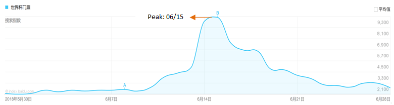 Similarly, during 2018 world cup season, the searches on Baidu.com about event tickets soaring to a peak on June 15th, hours after the opening ceremony of World Cup 2018. News reported that the China’s event ticket sales reached to 40,251, 30 times more tourists than the last Brazil world cup’s (which is because the geographical proximity but also the rising interest for the sport in China).